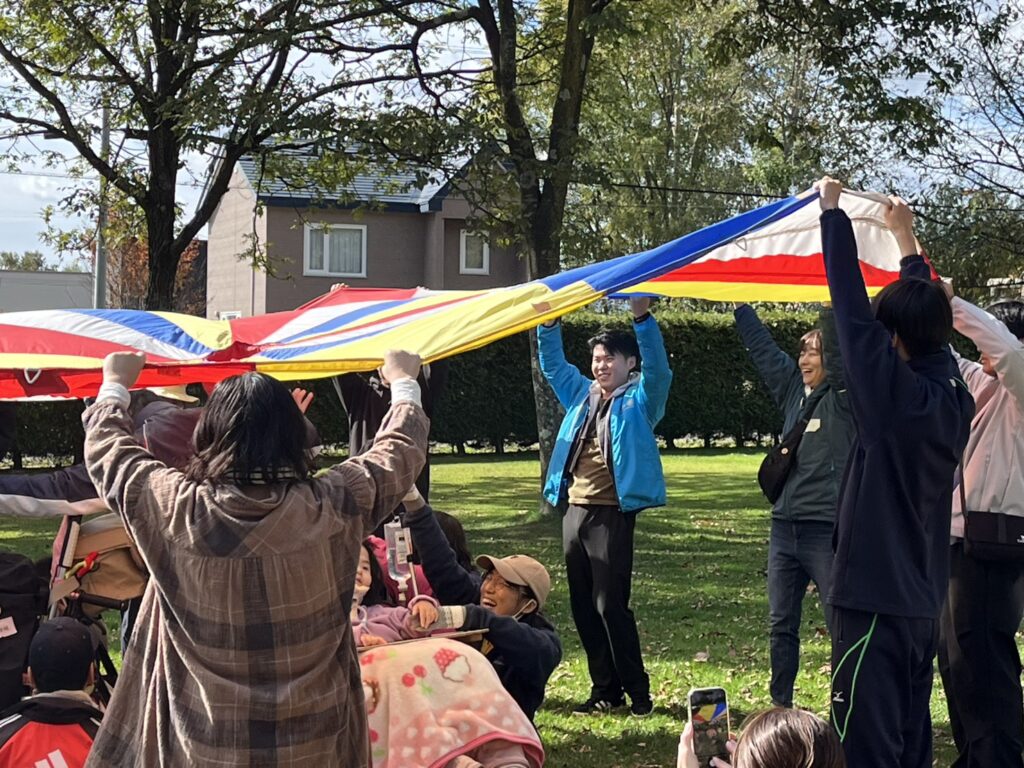 この交流会は、日頃外出の機会が限られがちなご家族に、安心して楽しいひとときを過ごしていただくことを目的としています。当日は、医療的ケア児とそのご家族、旭川西高等学校インターアクトクラブの生徒5名と藤村教諭、そして当クラブ会員の総勢16名が参加しました。